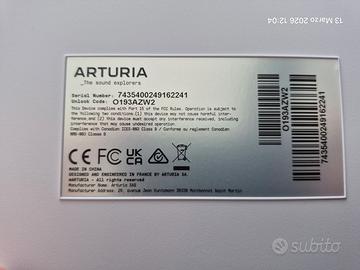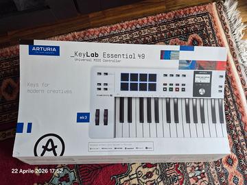 Vendo Arturia KeyLab Essential 49 MK3 bianca, tastiera MIDI USB professionale, perfetta per produzione musicale in studio e live. Caratteristiche principali - 49 tasti sensibili alla velocity - 8 pad RGB velocity sensitive - 9 knob + 9 fader - Encoder grigliato + display LCD - Pitch bend e modulation wheel - Arpeggiatore, chord mode, scale mode - Compatibile Mackie/HUI - Oltre 2000 preset (Analog Lab) Connessioni complete USB-C (alimentazione + MIDI), MIDI DIN, ingresso pedale. USB class compliant. Software incluso Komplete 15 Select (NI), Ableton Live Lite, Analog Lab, UVI Model D, NI The Gentleman + altri bundle. Nota: Licenze software trasferibili secondo politica dei produttori (Arturia / NI / UVI). Trial e promozioni non trasferibili. Specifiche -Dimensioni: 790 × 240 × 70 mm -Peso: 2,76 kg Acquistata il 10/10/2025 da Thomann (fattura disponibile). Perfette condizioni, usata pochissimo, pari al nuovo. Completa di scatola originale. Supporto Tastiera non incluso Prezzo non trattabile (già basso rispetto al nuovo) No perditempo, solo interessati