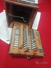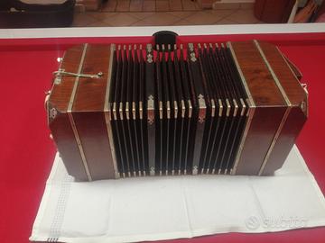 Bandoneón AA (Alfred Arnold) "marron liso", datable de la fin des années '20 (voir timbres au somiers, à l'intérieur, côté main gauche); très bonnes conditions générales. Plaques en zinc, révision et accordage d'époque par José CRIMI (voir timbres à l'intérieur). Claviers originaux. Soufflet neuf et compression parfaite, sans aucune perte d'air, après dernière intervention sur l'instrument d'il y a une dizaine d'années, en Argentine. Quelques voix a revoir, car l'instrument n'est pas joué depuis quelque temps. Deux petits pieds mancants. L'instrument se trouve e peut être testé à.......ecc