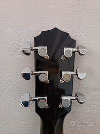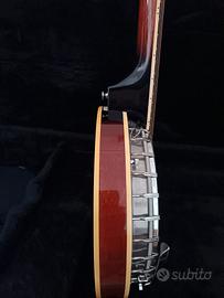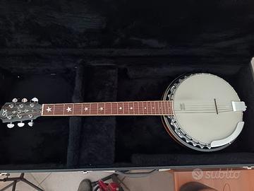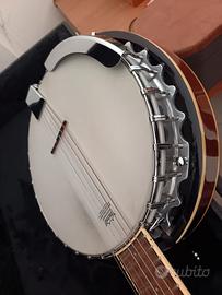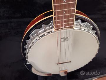 Banjo!/chitarra a 6 corde, suona con le stesse posizioni della chitarra. Corde metalliche con pelle Remo e guscio in legno pregiato. Bel suono tipico per musica folk jaz strumento molto bello vendo per inutilizzo.