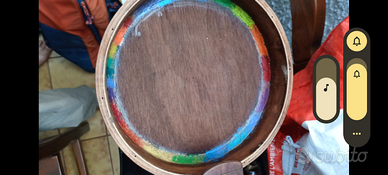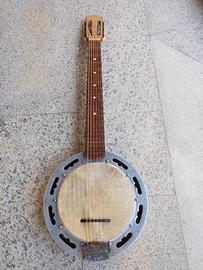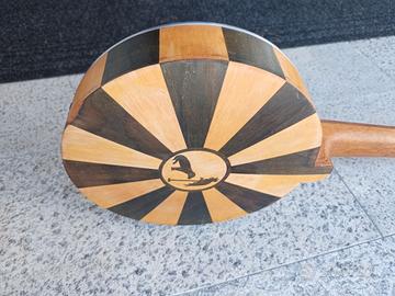 Banjo a 6 corde , pelle naturale , cassa intarsiata , ponte in ebano , non c'è etichetta identificativa del costruttore , e' stato restaurato in stile hippy ma originalmente sembrerebbe essere uno strumento dei primi 900 .