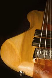Fretless bass 5 string neckthru singlecut scale: 35" Neck: mahogany-iroko Nut: wengé Fretboard: wenge with inlay positions Radius fretboard: 450mm Body: toulipié Pickup: 2 ceramic humbuckers Preamp: 3-band EQ 9v Control Knob: mahogany turned by hand Finish: padded shellac and carnauba wax