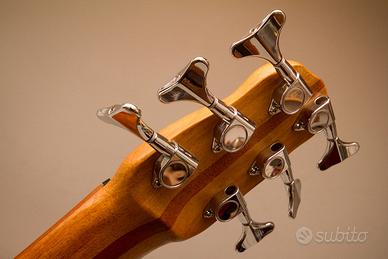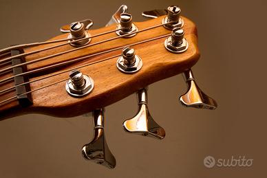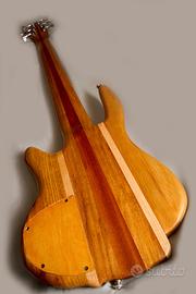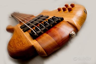 Fretless bass 6 string neckthru singlecut scale: 35" Neck: mahogany-iroko Fretboard: teak with maple inlay positions Radius fretboard: 450mm Body: Iroko-frassino Pickup: 2 ceramic humbuckers Preamp: 3-band EQ 9v Control Knob: mahogany turned by hand Finish: padded shellac and carnauba wax