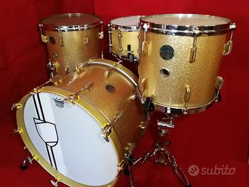 Vendo batteria rara e di qualità della Desidera e figli acquistata nuova da mio padre nel 1951 colore Gold Glitter. L'offerta include: tom 13x9, timpano 16x15, gran cassa 22x14, rullante 14x7, solo i tamburi, no meccaniche. La cassa il tom e il timpano hanno i fusti in legno di faggio dello spessore di 4 mm con rinforzi ai bordi sempre in faggio di 8 mm in totale. Il wrap su ogni tamburo è ottimo e non presenta nessuna scollatura, stesso discorso per tutti i legni dei tamburi che non hanno scollature. L'interno dei tamburi ha la stessa verniciatura metallica delle batterie Gretsch e ogni tamburo riporta all'interno la targhetta con la dicitura: Fabbrica Strumenti Musicali L. Desidera & Figli. Le parti non originali sono i cerchi die cast che sono della Tama, le Pelli sono Remo Renaissance Emperor, battenti, Remo Ambassador Clear risonanti. I piedi della cassa sono quelli professionali della Pearl che ancorano perfettamente la cassa. Tutti i blocchetti, le graffe e le viti del tom, del timpano e della cassa sono quelli originali. Le viti e gli inserti dei blocchetti, sono in ottone pieno e mantengono l'accordatura in maniera eccezionale. Il rullante 14 x 7 è un fusto Tama Superstar degli anni '80 in legno di betulla con tutte le meccaniche e pelli nuove ed è stato customizzato nel colore gold per essere usato nel set Desidera. Il tom da 13 pollici calza perfettamente le pelli mentre al timpano da 16 e alla cassa da 22 è stato aggiunto ai blocchetti uno spessore in legno di pochi millimetri per far calzare perfettamente le pelli da 16 e 22 in quanto la batteria considerata l'età è con misure pre-international. Il suono della batteria è vintage, potente, equilibrato in quanto alti, medi e bassi sono emessi senza enfatizzare nessuna frequenza in particolare, l'attacco è strepitoso, il suono è molto pieno, tondo, caldissimo con un decadimento veloce, è lo strumento ideale per lo studio di registrazione.