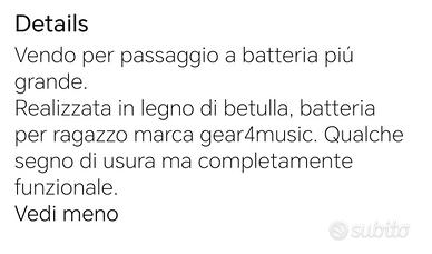 Ottima batteria per avvio allo studio delle percussioni. Non giocattolo ma strumento musicale. Acquistata dalla ditta Gear4Music specializzata nella vendita di strumenti musicali. Vendo per passaggio a batteria piú grande. Realizzata in legno di betulla.