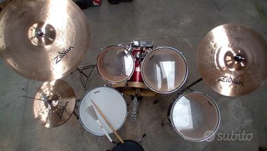 Il set dei tamburi Made in China è in rosso ciliegia lucido – hardware della Mapex – piatti Zildjian Made in U.S.A.