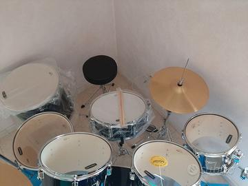 La batteria è di colore blu, mentre i Tom aggiuntivi sono neri. ni