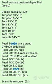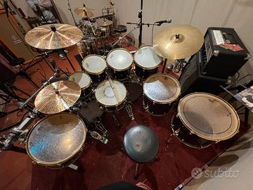 Vendo batteria in ottime condizioni sempre tenuta in studio di registrazione professionale no umidità ne altro. È stata completamente lucidata e praticamente non presenta difetti. Misure in foto.Nero lucido meccaniche oro. Unico proprietario. Sistema Optimount e Rack a sostenerle quindi nessun foro sui fusti. Cerchi die cast. Sound potente casse spaziali e piu lunghe del normale. Tutta in acero con cerchi di riforzo. Pelli in buono stato e di qualità, evans retro screen su risonanti cassa. Completa di custodie semirigide per ogni pezzo e hardcase per aste. Meccaniche pedali rack etc. in foto/descrizione con i vari codici . moltissime pelli di ricambio usate e nuove per ogni pezzo.Vendo e non svendo a malicuore perchè è una bellissima batteria. Non vendo piatti ma se ne puo parlare in trattiva.Prendo in considerazione offerte sensate.