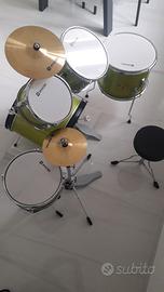 Batteria acustica per ragazzi, completa di 5 pezzi più due piatti, bacchette, sgabello, manuale di istruzioni, chiavi per accordatura tamburi