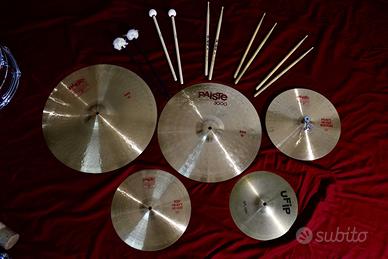 ride Paiste 2002 da 20”, hi-hat Paiste 2002 Heavy da 13” (top e bottom heavy), Paiste 3000 ride da 18” e splash UFIP. Tutti i piatti sono in perfette condizioni.