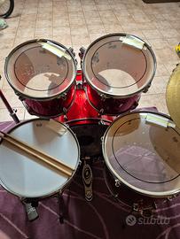 Come da titolo vendo batteria della Drum-com, completa di meccaniche, sgabello tamburo, piatto ride Paiste 302, hi-hat e crash con pelli pinstripe hydraulic nuove appena sostituite sui tom e sabbiata sul rullante, cassa da 22", tom 12 e 13", floor tom da 16" e rullante da 14", consegna a mano dopo visione e prova a 350€