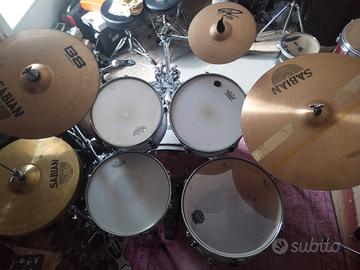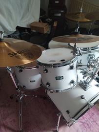 batteria acustica Tamburo t5 wrap bianco, misure: cassa 22 tom 12 13 timpano 16 rullante 14x4'5 completa di meccaniche originali, sgabello tamburo, mezz asta alla cassa Tamburo , corredata di set piatti Paiste o Sabian a scelta , più splash . strumento perfetto di grande impatto e sonorità importante .