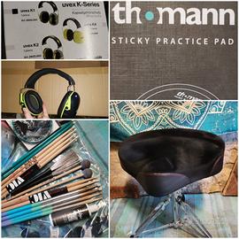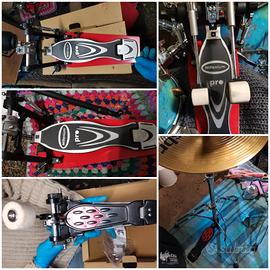 Vendo tutto, i piatti e le pelli sono state cambiate quando è stata comprata, in più ho altre pelli NUOVE, bracci per aste, pedali singoli e doppio, cuffie, pad d'allenamento e accessori vari come chiavi e bacchette che regalo col set...