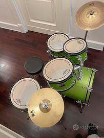 Vendesi batteria Dam per bambin, la batteria è composta da 1 Grancassa, 2 Tom, 1 Timpano, 1 Rullante, 1 Hit-Hat, 1 Crash, 1 Sedile, sono state montate pelli marca REMO USA modello Pinstripe!!!