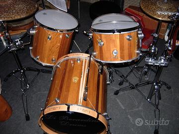 Vendo batteria artigianale Di Berarardino Drums modello Latin Jazz Set, fusti a doghe in legno tatajuba con sistema incasso brevettato, sistema accordatura a tirante unico brevettato, sistema tensione cordiera rullante brevettato. I PIATTI SONO INCLUSI NEL PREZZO. SOLO SET COMPLETO. cassa 18” tom 14” timpano 16” rullante 14” Pedale Tama Piatti: ride - Istanbul Mehmet serie Turk 20” hi-hat - Istanbul Mehmet serie Turk 14” crash - Zildjian K 15” crash - Anatolian 16” splash - Anatolian 8” Meccaniche complete Custodie personalizzate ‘Di Berardino’ Tutto in stato perfetto. RITIRO IN LOCO