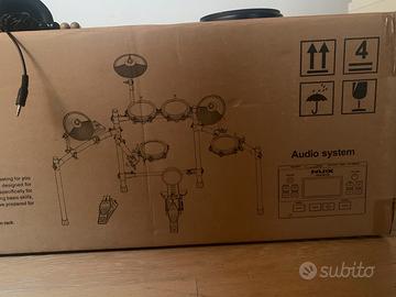 Batteria elettrica Nux DM-210 (prezzo listino 399€) usata pochissimo, con due set di bacchette 5b prese dall’Hard Rock di Chicago (prezzo listino 20€) e Vic Firth 7a (prezzo listino 13,90€), drum per pratica di Meinl instruments (prezzo listino 52€) e cuffie da collegare alla batteria, marca Quik Lok M10 (prezzo listino 29€), il tutto in confezione originale e completo di istruzioni complete per l’assemblaggio