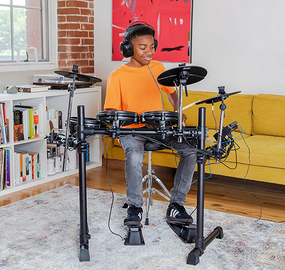 Esclusiva configurazione a sette pezzi - Pelle mesh da 8" per rullante, 3 pelli mesh da 8" per tom, 3 piatti da 10" e pedali custom Alesis per hi-hat e grancassa