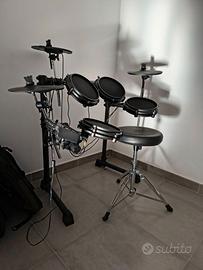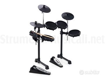 Pelle mesh da 8" per rullante, 3 pelli mesh da 8" per tom, 3 piatti da 10" e pedali custom Alesis per hi-hat e grancassa.