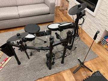 Compresi nel prezzo tutto gli accessori in foto, cassa Harley Benton, pedale grancassa, 5 coppie di bacchette nuove, sgabello, tappeto etc.