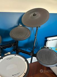 Vendo questa batteria elettronica per mancato utilizzo. È pari al nuovo. È una batteria adatta per lo studio da poter suonare in casa con cuffia oppure alimentata da un amplificatore esterno. È possibile fare un aggiornamento per poter inserire il Charleston con asta.