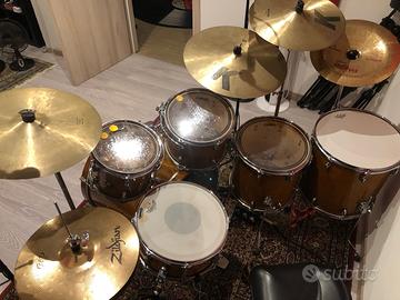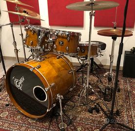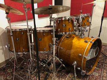 batteria in ottimo stato, niente graffi o botte. Fusti: in Acero a 7 strati. Cerchi tom e rullante: Tripla flangia 2,5mm. Cerchi cassa: Acero a honey amber lacquer. Cassa: 22"x18". Tom: 10"x8”, 12"x9”. Timpani: 14"x14", 16"x16". Rullante: 14"x 6". In acero con finitura laccata color miele ambrato (a honey amber lacquer). Pelli appena cambiate, in ottimo stato. Usata solo in studio, niente live. Solo Fusti, ma eventualmente disponibili le meccaniche e piatti, con un costo a parte. Regalo custodie morbide per i fusti. Solo ritiro a mano.