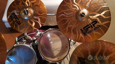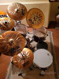 Vendo batteria Hoffman colore bordeaux completa di piatti, sgabello, aste, leggio Piatti Ufip Tiger Series: - hi-hat 14"/35cm - crash 16"/40cm - crash 18"/45cm - splash 12"/30cm - ride 20"/40cm Batteria conservata benissimo, non è mai stata smontata, né spostata. Come nuova. Vendo per mancanza di spazi.