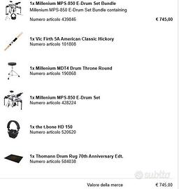 Usata solo una volta dopo averla montata, praticamente nuova, vendo batteria Millenium MPS-850 E-Drum Set Bundle compresa di bacchette, seggiolino, cuffie e tappeto, Configurazione del set: 1 pad rullante da 10" a due zone con pelle mesh, 2 pad tom da 08" a due zone con pelli mesh, 2 pad tom da 10" a due zone con pelli mesh, 1 pad grancassa da 08" con con pelle mesh, 2 pad crash da 12" a due zone con funzione choke, 1 pad ride da 12" a tre zone con funzione choke, 1 pad hi-hat da 12" con controller su supporto