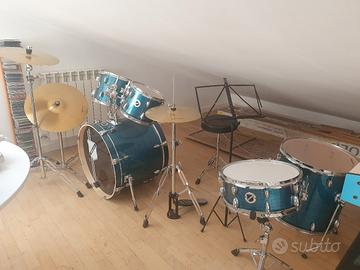 Batteria completa Millenium,composta da grancassa e tom,Charleston,piatto e rullante,compreso leggio e sgabellino,colore blu,come nuova.