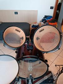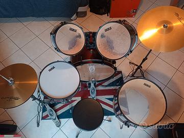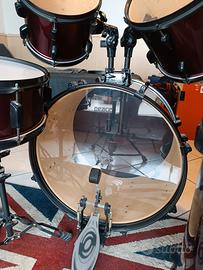 Batteria Peace DP-101-9RW colore Wine Red completa, con grancassa, timpano, rullante, due tom, hi-hat, piatto crash-ride, sgabello e due paia di bacchette (punte in legno e punte in plastica). Usata molto poco.