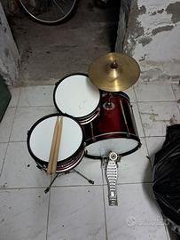 Batteria junior 3 pezzi, colore rosso lucido, completa di hardware a singolo braccio, pedale, piatto, supporto piatto su grancassa e bacchette. Sgabello non incluso. Configurazione:cassa 16"x11", tom 10"x6", rullante 10"x5". Modello indicato per bambini da 4 a 7 anni. Bologna, zona San Donato neri pressi della sede del quartiere.