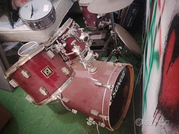 Piena di polvere perché non la uso da tanto. C'è da cambiare pelle cassa e pelle rullante per il resto è ok. Regalo anche due piatti in omaggio