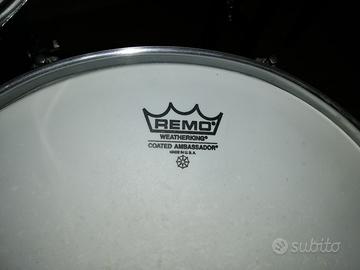 Tutte le Pelli Nuove REMO Ambassador, presente pedale Gran Cassa originale più pedale DW3000, seggiolino Yamaha, piatti: Sabian B8 cm. 25 China Splash, Zildjian Scimitar Crash/Ride cm. 45, coppia piatti Charleston Cayman più coppia Paiste Heavy Hi-Hat Top da 14", piatto Tosco cm. 50, campanaccio,