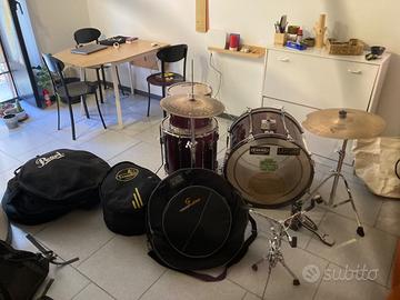 Vendo batteria Tama Rockstar TOM 12, TOM 13, TIMPANO 16, CASSA 22, vendo anche meccaniche (aste e reggirullante), custodie e piatti (hit hat e crash), la batteria è usata ma ideale per chi inizia o ha bisogno di uno strumento su cui fare pratica.
