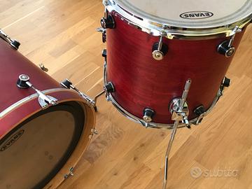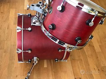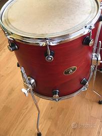 Batteria Tamburo serie Studio in betulla. Finitura cherry con venature a vista. Cassa 18x16, tom 12x9, timpano 14x14, tre gambe timpano, supporto tom su cassa.
