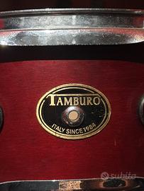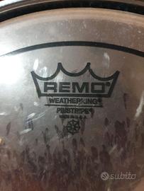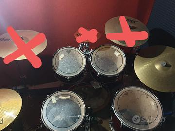 Batteria 5 pezzi colore bordeaux con venature del legno visibili. Cassa 22', Tom 12', Tom 13', timpano 16', rullante 14'. Pelli Remo Pinstripe Weather King sui due tom, sul timpano e sul rullante usate come da foto. Piatti Paiste 101: hi-hat 14', crash 16', ride 20' tutti compresi di aste. Sgabello e pedale compresi.