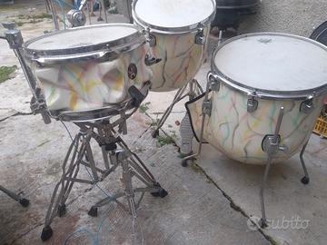 I bordi dei fusti sono rinforzati con cerchi neri. tom e pedali, che sono in acciaio cromato.MANCANO I PIATTI.UN TAMBURO HA UN PICCOLO BUCO VISIBILE IN FOTO. per qualsiasi informazione contattare senza impegno