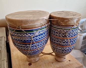 Vendo doppio bongo in ceramica dipinta e pelle di bue. Altezza 24,5 cm, diametro 20 cm + 13 cm
