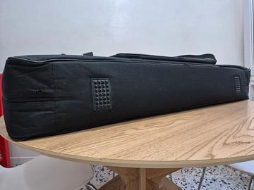 Borsa morbida per tastiera 61 tasti, con imbottitura da 15 mm. Colore nero. Maniglia rinforzata con chiusura a strappo in velcro. Tracolla regolabile con moschettoni e ampia tasca frontale. Gommini paracolpi in gomma . Robuste cerniere lampo cucite. Poco utilizzata con qualche segno d'uso visibile in foto.