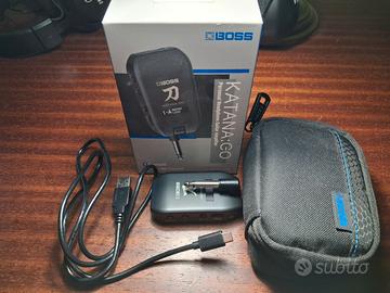 Boss Katana Go: Amplificatore per cuffie compatto Alimentato a batteria e dotato di un buon suono per chitarra e basso 5 tipi di amplificatori per chitarra e 3 per basso con equalizzazione, gain e volume Decine di effetti di alta qualità, compresi i classici suoni dei pedali Boss Comprende Custodia con cerniera e cavo usb per ricarica Disponibile fattura e garanzia di 3 anni (comprato a giugno ed usato solo un paio di volte) pagato su Thomann € 139 NON spedisco, solo consegna a mano a Catania e Paesi Etnei