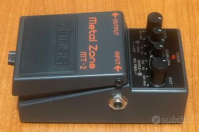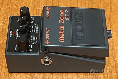 BOSS MT-2 Metal Zone Effetto distorsione a pedale per Chitarra Pari al NUOVO Confezione originale Il Mostro High-Gain che Supera il Milione di Unità Vendute Presentato nel 1991, l'iconico MT-2 Metal Zone resta il re dei distorsori high-gain a pedale per i chitarristi di tutto il mondo, con oltre un milione di esemplari venduti, e la cifra continua a crescere. Il suo sound denso e saturo si adatta perfettamente agli stili metal, ed è insuperabile per la parti ritmiche più heavy e per assoli ruggenti in altri generi. Con incredibili possibilità di regolazione del suono e con un sustain fluente e cremoso, il versatile MT-2 offre un vasto arsenale di ricchi suoni distorti, adatte a ogni applicazione musicale. Caratteristiche principali Pedale di distorsione dal suono incredibile con circuito a doppio gain unico Sustain lunghissimo con medi e bassi heavy come uno stack di amplificatori distorti EQ 3-bande con controllo Mid semi-parametrico offre una vasta gamma di distorsioni estreme Un must-have per ogni chitarrista hard rock o metal