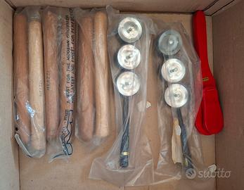 contiene: 2 Wood block 2 Jingle stick 3 coppie di Legnetti musicali Meazzi 1 Tacatac 1 Tamburo + battente 1 Tulip block 4 Triangle large Angel 2 Triangle small Angel 1 terre sleigh bells