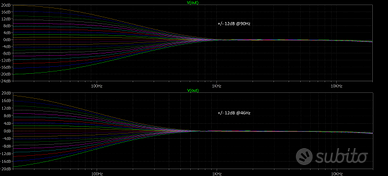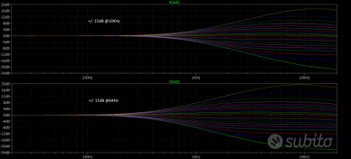 Si tratta di un preamp boost/cut che può operare a 2, 3 oppure 4 bande con la possibilità di selezionare due frequenze per ciascuna banda: nel caso di alte e basse questa operazione avviene per mezzo di un jumper apposto sulla PCB stessa mentre nel caso delle medio-basse e medio-alte si possono selezionare le due proposte sia tramite switch sia tramite push/pull. A differenza di ogni altro preamplificatore onboard, questo progetto non si avvale di un semplice partitore di tensione per quanto riguarda lo stadio di alimentazione (che rimane comunque una buona soluzione tecnica) ma utilizza quella che viene chiamata "alimentazione duale". Tale scelta permette a questo progetto di avere la più bassa rumorosità possibile e di sfruttare completamente il proprio potenziale. Dimensione PCB EQ: 40mm x 28mm Dimensione PCB Alimentazione: 32mm x 28mm Nello specifico le bande operano sulle seguenti frequenze: +/- 12 db @46Hz o @90Hz per le basse +/- 12 dB @330Hz o @473Hz per le medio-basse +/- 15 dB @1KHz o @1.8KHz per le medio-alte +/- 15 dB @6KHz o @10KHz per le alte Naturalmente è possibile scegliere alternativamente le sole medio-alte o le sole medio-basse ed anche solo una delle due frequenze proposte nel caso di funzionamento a 3 bande. Il tutto viene fornito con potenziometri M8 e lunghezza filettata di 10mm e nel solo caso delle bande con click centrale; tali dimensioni permettono il fissaggio sia su battipenna-piastra sia direttamente a legno. Il circuito comprende sempre un volume push/pull per attivo-passivo e poi a richiesta è possibile avere un secondo volume o un blend; dopodichè si hanno le bande (2, 3, 4, concentrico alte/basse, switch vari o push/pull..). Visto la quantità di varianti che questo progetto propone vi invito a scrivermi prima di acquistare così che possa fornirvi il tutto secondo vostre specifiche e senza sovrapprezzo! Si tratta di un cablaggio pensato per andare a sostituire interamente il circuito pre-esistente, anche jack!
