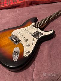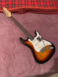 Chitarra = manico in acero, tastiera in palissandro, pick-up 3 single coil, selettore a 5 posizioni, 1 manopola del volume e 2 toni, ponte con leva del tremolo standard, colorazione Sunburst.
