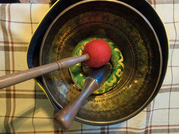 vendo nuova campana tibetana fatta e battuta a mano in Nepal, questo è un autentico strumento utilizzato per la meditazione, cura del corpo e mente. Diametro 25cm, peso 1.5kg, inclusi 2 battacchi, cuscinetto e custodia.