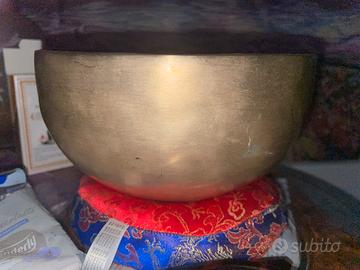 Nuova Campana tibetana Nirmala —-1000-1250 g; 20 cm + battente + supporta anello per campana. Campana realizzata a mano in 74/75% rame, 25% stagno e 8 metalli nobili (Ag, Ni, Cd, Ru, Pd, Pt, Cr, Mn).
