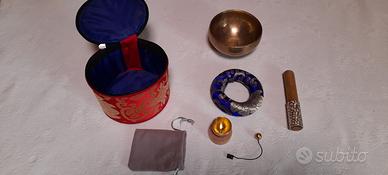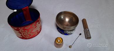 Set meditazione composto da: bella campana tibetana in bronzo fatta a mano larga 10.5 cm alta 5 cm pesa 280 grammi. Completa di mallet in legno e pelle laminata oro, cuscinetto in raso, campanella ottone 3 cm con base in legno e màllet dedicato, borsa rigida in raso. Vendo nuovo euro 40 non trattabili. Disponibile a Lissone.