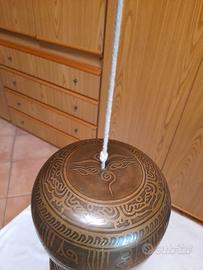 Campane tibetane in bronzo con decorazioni in set di 5 pezzi a sospensione (lunghezza corda un metro) con peso complessivo 3362 grammi e precisamente: