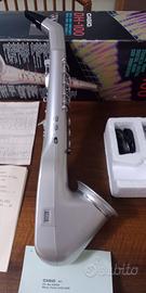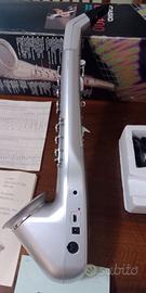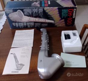 Il Casio DH-100 è un "Digital Horn" (strumento a fiato digitale), a forma a sassofono in plastica argento facile da usare. Dispone di sei suoni preset (sax, tromba, clarinetto, ecc.), altoparlante integrato, uscita MIDI e controllo di respiro. N. B.: Manifesta purtroppo un tipico difetto congenito: in ascolto altoparlante e cuffia, emette un fastidioso suono sibilante (squawk) che si sovrappone alla nota musicale generata. Il problema può essere risolto da un valido tecnico, vedi info in rete e specifici tutorial •Utilizzo: Semplice, con diteggiatura di tipo flauto dolce e controllo della dinamica basato sulla forza del respiro. •Suoni: 6 voci interne (Sax, Trumpet, Synth-reed, Oboe, Clarinet, Flute). •Connettività: Porta MIDI OUT (per utilizzarlo come controller con moduli esterni), uscita cuffie/amplificatore, altoparlante interno. •Controlli: Pulsanti per l'ottava, pulsante "portamento" per effetti slide, e funzione "breath control". •Alimentazione: presa alimentazione a 7.5V - 5 x batteria stilo AA.
