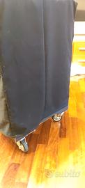 La cassa è alloggiata su un carrellino in legno costruito da me per agevolarne il trasporto (è agganciata tramite velcro) ed è dotata di copertura in panno morbido di sartoria fatta su misura per tenerla sempre protetta e pulita.