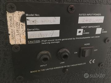 2 casse da basso. 1 cono da 18 e due da 10 . Sono customizzate utilizzando cabinet peavy Made in usa , e (credo) Laney Made in uk . sostituendo i coni con un 18 bheringer eurolive da 400 w e due x 10 EMINENCE facendole così lavorare su impedenza 8 ohm ciascuna . io le ho comprate da chi ha fatto il lavoro. Misure: entrambe con larghezza 60, profondità 42 la piccola, 45 la grande. La grande è alta 83 cm con rotelle . la piccola 45 . Sono vecchio e ho due ernie , quindi.. venite a provarle /ps : la testa in foto è già venduta