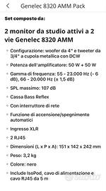 Vendo per cessazione attività genelec 8320A. Monitor dí riferimento professionali da studio + microfono per la rilevazione della risposta in frequenza della stanza + centralina per il controllo e jog per il volume. Perfette e senza graffi o usura. Spedisco ma preferisco il ritiro di persona con prova di tutto. No perditempo. No affaristi. Controllate su mercatino musicale o thomann il prezzo. Pagamento con bonifico